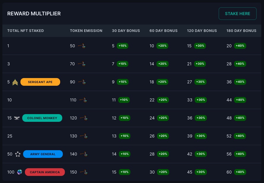 Rewards or token yields can be given custom variables for creators wishing to have dynamic yields with multiple NFTs staked or time-variable. Additional features for staking yields can be custom designed (i.e., in-game Experience Points).&#x20;