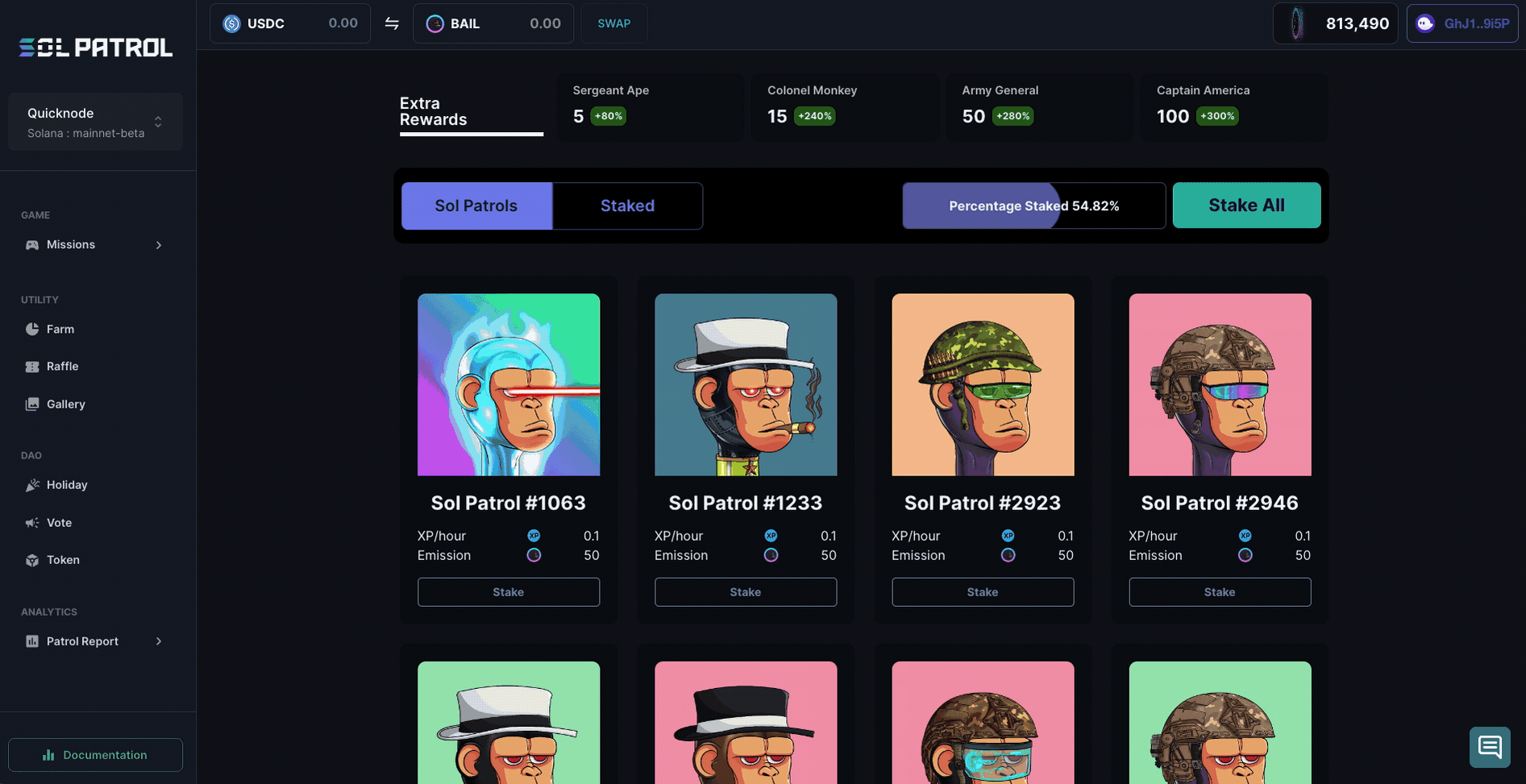 The Sol Patrol development team has created multiple custom staking solutions. It's one of the first contracts that our team developed and deployed on Solana mainnet for the NFT community Sol Patrol. The staking contract is not based off any pre-existing code base (i.e., Gem Farm or the like) but was custom developed in Q4 2021 and has been under numerous revisions for a smooth user experience.